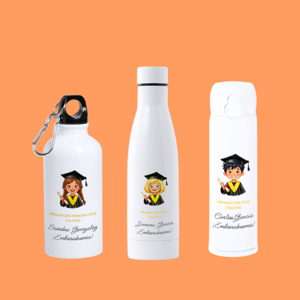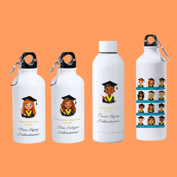 Gracias a su versatilidad, estas botellas se adaptan a cualquier nivel educativo, desde educación infantil hasta primaria y secundaria, convirtiéndose en un recuerdo duradero que acompaña durante años.