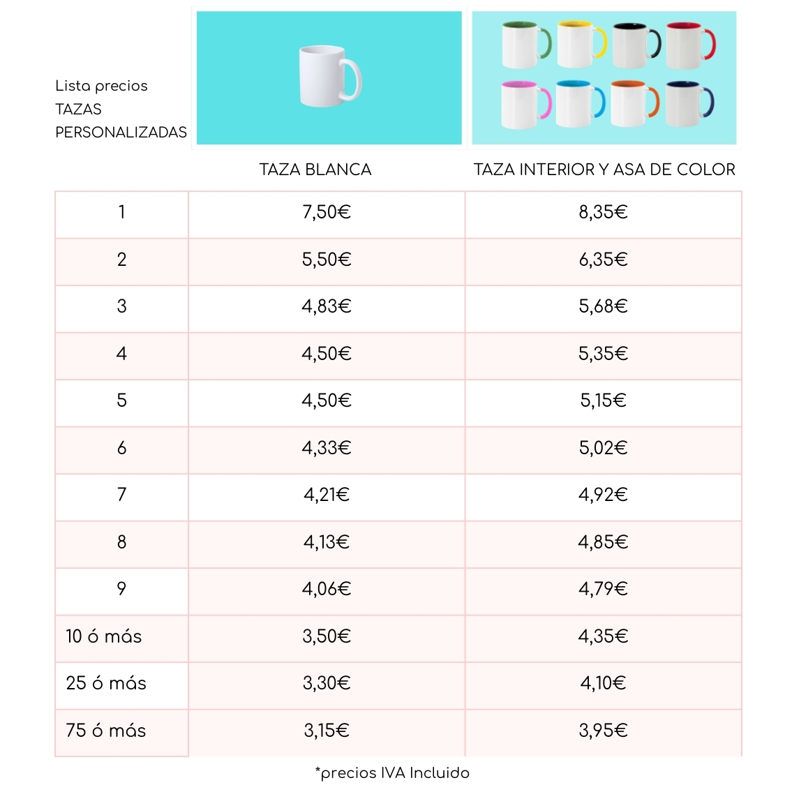 El proceso de personalización es sencillo y rápido. Solo tienes que elegir el diseño que más te guste y facilitar los datos necesarios. Nos encargamos de todo el proceso, cuidando cada detalle para que el resultado final sea perfecto. Cada taza se revisa cuidadosamente antes del envío para garantizar que llegue en condiciones óptimas y lista para regalar.